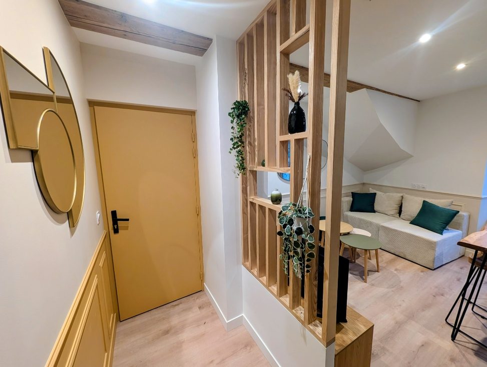 Agréable et lumineuse pièce de vie avec cuisine ouverte équipée aménagée, chambre avec salle d'eau privative et WC indépendant.