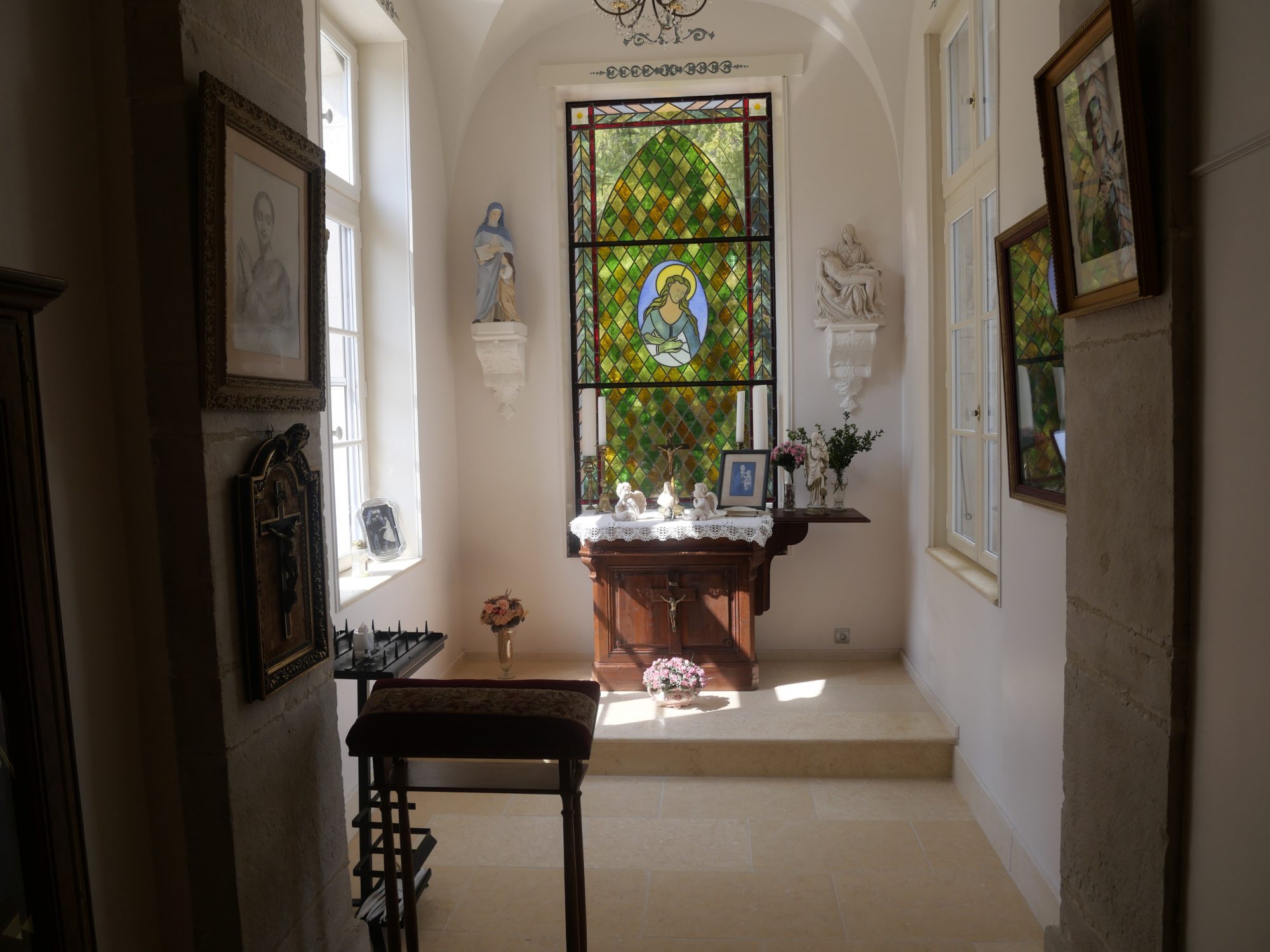 Au rez-de-chaussée, un hall d'entrée en dalles de Bourgogne, donnant accès, à gauche, à une chapelle, ornée d'un magnifique vitrail, dédiée à Sainte Elisabeth de la Trinité(qui venait enfant jouer du piano au château et qui fut canonisée le 16 octobre 2016) en face, un couloir menant à un bureau et à une première chambre, avec salle d'eau privative et à droite un grand salon, baigné de lumière et mettant en valeur un plafond à la française avec poutres et solives peintes. Dans le prolongement de ce salon, un boudoir avec cheminée en marbre et sol en pierres de Louxor, donnant sur l'entrée méridionale et distribuant, une cuisine adaptée à une utilisation résidentielle avec accès sur une belle terrasse.