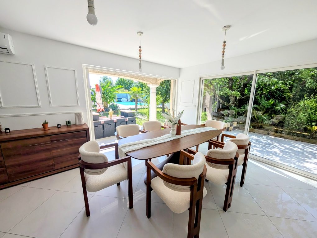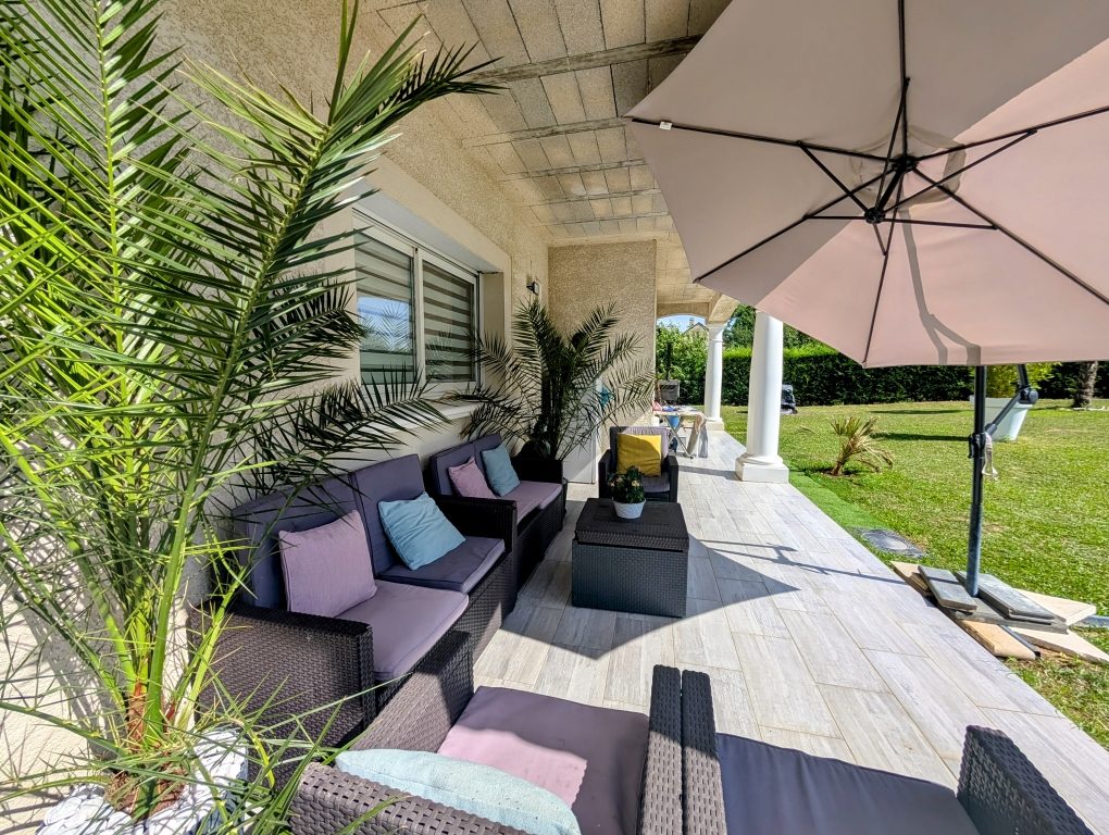 L'extérieur nous offre un beau jardin sans vis à vis, une grande terrasse, une piscine et un grand garage double (dépendance) de 56 m².